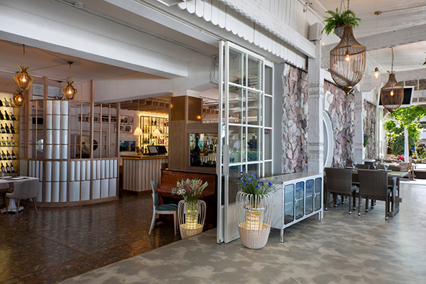 該紅網餐廳位于索契黑海沿岸是以鄉村風格為主題打造。公共服務臺被幾百片藍色小魚鱗所包圍,配以淡黃色的暗藏燈光,讓整個空間顯的格外的融洽。值得我們注意的是白色做舊柱子,每根柱子都互相連接并固定和支撐起來了所有頂棚承重,矩形柱體上的花紋是本地獨有的特色文化。餐廳四周是由碎拼文化石組成的墻面,該種材料在施工時須要凌亂錯綜復雜,排列時也不那么遵循規律性,而就是這種方式卻能快速把人帶進大自然的懷抱中。